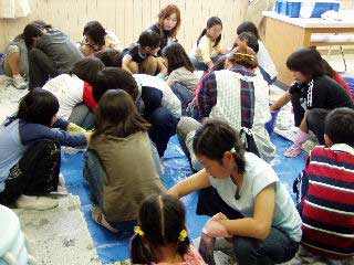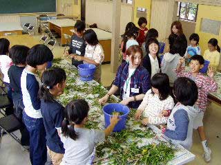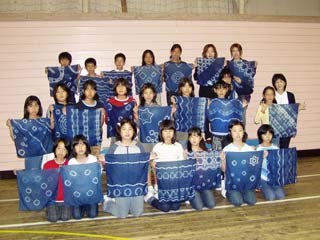 こどもエコロジーキャンプ 藍の生葉染め 穴水町ふるさと体験村「四季の丘」 石川県内の小学生高学年21人と、大学生のボランティアスタッフ5人が参加しました。 藍の花が今を盛りと咲いています。今年の藍の「生葉染め」は、これが最後になりそうです。 葉だけを採りミキサーで粉々にして絞った生葉の液を使います。ハンカチに輪ゴムや割り箸を使って絞りの模様をつけて、しばらく水に浸しておきます。 藍の緑色の液の中で染めたハンカチを、水や空気に触れさせて酸化させます。緑色だったハンカチが藍色に発色します。これを2回繰り返してできあがり。 教室のあちらこちらに散らかった藍の葉やゴミ等を片付けて、濡れた床を掃除してお終い。 その後、体育館で記念写真を撮りました。 この農業体験のできる「四季の丘」は廃校になった小学校をリニューアルした自炊型宿泊交流施設です。子供も大人も利用でき、とても格安料金なのです。 草木染めを初めて体験する子供たちも多かったのですが、それぞれ面白い絞りに染め上がりました。 木綿のハンカチにも藍の生葉染めは、しっかり濃く染まるのでした。 |