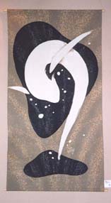 草木染作品 「跳ねる」 木綿布 90×170cm ローケツ技法の作品 ゴバイシ、ヤシャブシの抽出液を引き染めして鉄媒染を重ねローを描き染め重ねたタペストリー |